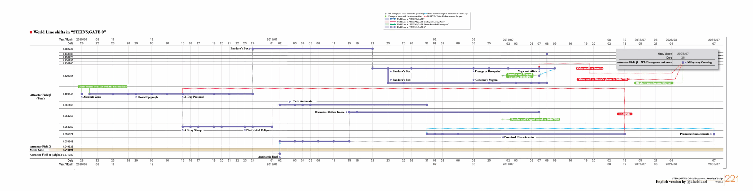 For that matter, Steins;Gate 0 is actually largely not an original story. Rather, it is based on three pieces of side material that existed before it: Arc-Light of the Point at Infinity, the Epigraph light novel trilogy, and the ending of Annularly Chained Ouroboros. And it is specifically from Ouroboros that world line recursion originates—a concept critical to understanding virtually all Beta attractor field material in the Steins;Gate subseries.