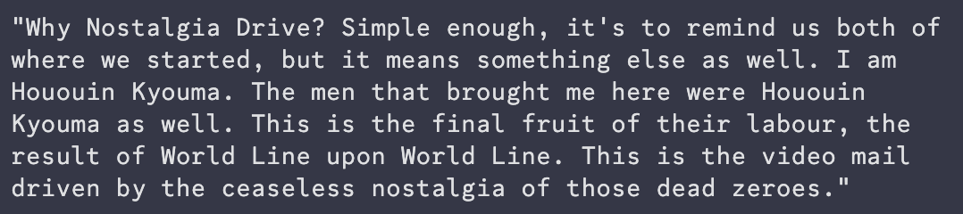 That in and of itself is quite vague. You could interpret this as them just letting there be an inconsistency in the story in order to get people to just play Promised Rinascimento before Vega and Altair. Or perhaps you could interpret this as the D-RINE operating by a world line targeting system, very similar to how the Nostalgia Drive is said to work in Annularly Chained Ouroboros. For context, the Nostalgia Drive is sent to a set of different world lines, which is why you see it in-game in Okabe’s phone history even in all the Alpha world lines. But it is, of course, only truly unencrypted on one particular world line after reaching a certain set of conditions. If the D-RINE does operate by a world line targeting system, would that particular iteration of Okabe have been able to figure it out that soon, though? It ends up being rather puzzling.