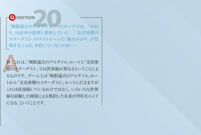 On note of the connections between the routes, as mentioned earlier, a lot of people are under the misconception that Milky-way Crossing is a direct continuation of the Vega and Altair iteration, when it is in fact not. Rather, there are countless iterations that take place in between these two endings, each serving as a messenger to another—as is confirmed by SciADV series lead writer Naotaka Hayashi in the Steins;Gate 0 Amadeus Script guidebook. This is why Kagari dies in Vega and Altair brainwashed with Yuki’s appearance, but is alive in Milky-way Crossing, not brainwashed and with her original appearance. Milky-way Crossing is the culmination of all prior iterations—it isn’t simply the epilogue to Vega and Altair.