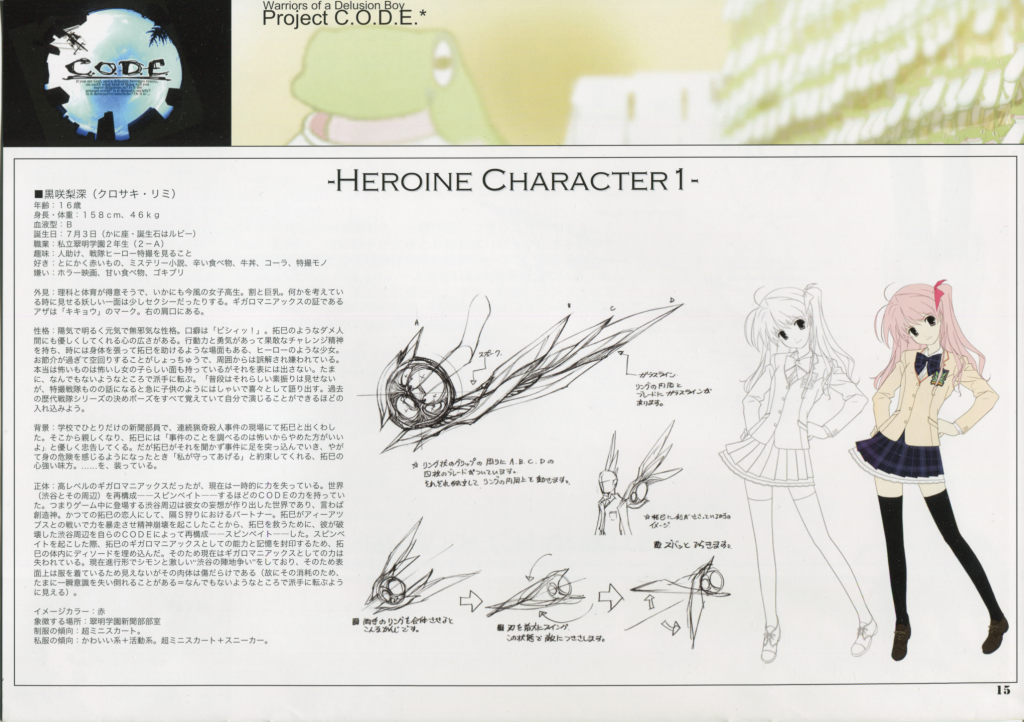Aside from the story, Project C.O.D.E. also had different names and personalities for a good chunk of the central cast. For instance, Rimi Sakihata was Rimi Kurosaki, Sena Aoi was Risa Aoi, Yua Kusunoki was Yua Hiiragi, Kozue Orihara was Kae Oozora, Ayase Kishimoto was Sayumi Kishimoto, and Gen’ichi Norose was a homeless French man named Simon Germain. In this iteration of the story, Takumi was a delusional shut-in like he was in the final version. However, this element was toned down, with Takumi actively interested in pursuing the truth behind the murders in spite of Rimi’s warnings against doing so. With that, Rimi was actually from their school’s Newspaper Club, making their dynamic a little closer to what was eventually seen out of Takuru and Nono in Chaos;Child. But as it turns out, she is constantly locked in a battle with Simon Germain over control of the simulated Shibuya. And the reason they’re all in this simulated Shibuya in the first place is because Rimi wanted to seal Takumi’s memories and powers away in order to save him. As for the other characters, their personalities and the twists surrounding them were also quite different. Originally, it was Nanami that was a delusional existence, as opposed to Takumi. Yua was also supposed to be Grimm instead of Hazuki. Kae or Kozue was able to speak. And it was Risa or Sena who was locked away in a mental hospital rather than Sayumi or Ayase.